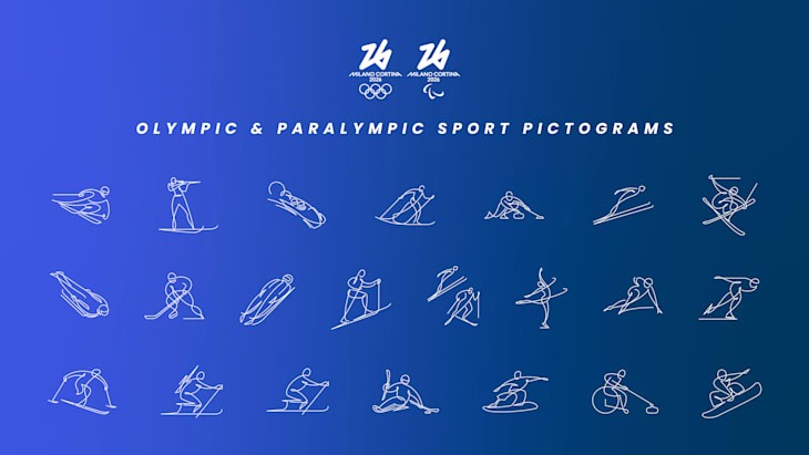 I pittogrammi delle discipline sportive sono probabilmente la parte più riuscita. Linee bianche su sfondo scuro, figure stilizzate che catturano il movimento degli atleti. Semplici, eleganti, funzionali. E coerenti col concept: sono letteralmente gesti atletici tradotti in grafica.